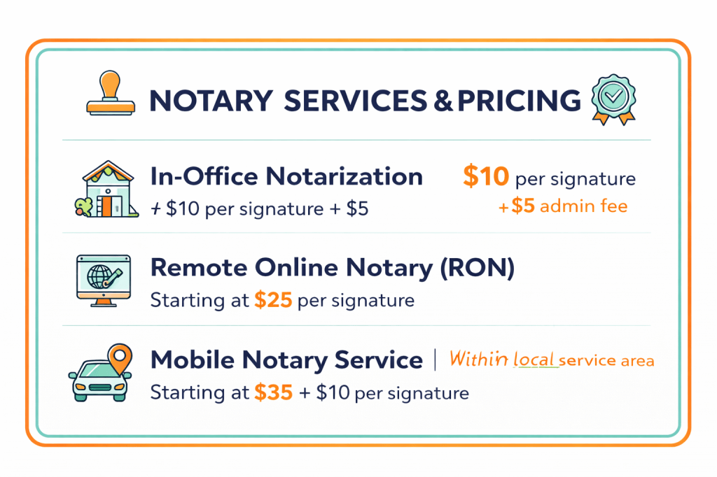 Schedule a one-on-one appointment for professional notary services tailored to your needs. We offer convenient options including in-office notarization, mobile services within the local area, and secure remote online notarizations.